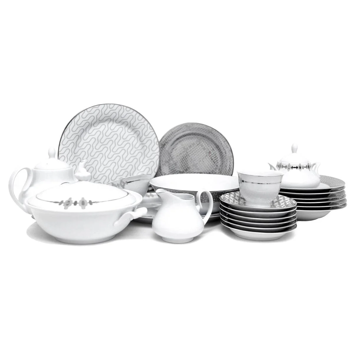 Enrich your dining experience with our 45pcs Silver Chevron Dinner set. This high-quality Ceramic set is Stylish with its exquisite Patterns and a perfect fit to showcase at intimidating events and serve guests.